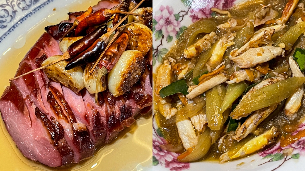 อาหารสำรับเเรกเชฟเริ่มด้วย “ขนมจีนซาวน้ำ” ดับร้อนได้ดีทีเดียว เส้นขนมจีนที่ทำมาจากเเป้งข้าวเจ้าราดด้วยน้ำกะทิ ลูกชิ้นปลากราย สัปปะรด และกุ้งแห้งป่น ต่อด้วยเมี่ยงคำ เชฟใช้ใบชะพลู เสิร์ฟในกระทงทอง พร้อมข้าว 5 ชนิด เชฟเล่าว่าวัฒนธรรมการกินเมี่ยงในสมัยก่อนจะเป็นของขุนนางในวัง ใส่เครื่องไม่มาก ใช้กะปิคั่วในการปรุง